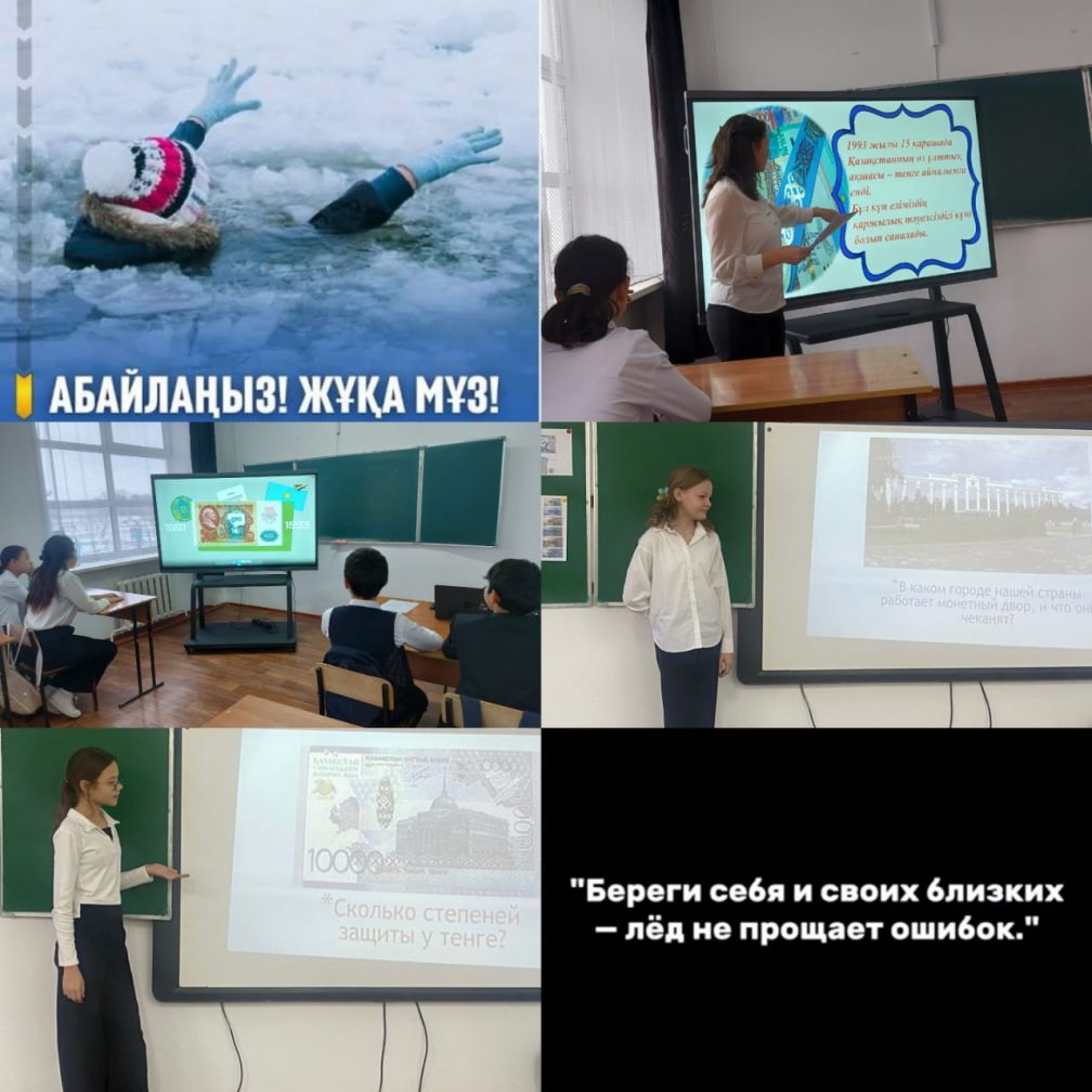 ақшаның пайда болу тарихы, өз ұлттық теңгеміздің айналымға кіруі, қалай, кімдер жасағаны туралы мағлұмат беру. Басқа ел валюталарымен таныстыру. Жаңадан айналымға енген ұлттық валюта, оны енгізудің қажеттілігі, безендірілуі туралы кеңірек таныстыру және "Жұқа мұз" тақырыбына әңгіме өткізілді.